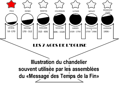 cas de Paul, l'âge se serait poursuivi plus de 100 ans après sa mort. C'est plus de 2 générations! La doctrine des 7 Âges de l'Église ne tient pas la route, puisque Paul ne peut en aucun cas être «l'ange/messager» d'Éphèse. Puisque les exhortations et les reproches du Seigneur sont adressés personnellement au messager cela signifie que les «messagers» sont des hommes qui ont reçu la grâce de la foi et qui sont appelés à naître de nouveau avec les mêmes critères qui étaient prescrits par le Seigneur à l'époque Apostolique. Si le Seigneur juge bon de rappeler à l'ordre certains de ses messagers, c'est parce qu'ils n'ont pas encore atteint le stade spirituel qu'ils doivent atteindre. La nouvelle naissance est un processus assez long et se compare à une naissance