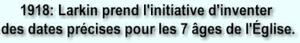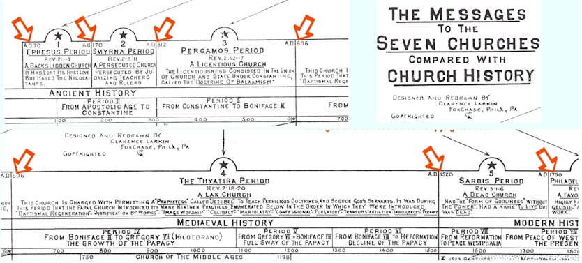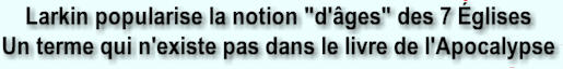 C'est Clarence Larkin qui décida de sa propre initiative en 1918, de publier pour la première fois, des dates exactes pour chacune des 7 périodes d'années relatives aux «soi-disant 7 âges» des Églises, et qui ont été reprises intégralement par William Branham sauf pour le dernier âge, que Larkin avait placé en 1900, et que William Branham a «ajusté» pour l'harmoniser avec son année de naissance, 1906. Croyez-vous vraiment que Dieu a donné les dates exactes des soi-disant âges de l'Église à Larkin? En tant que pasteur d'une assemblée Baptiste, les travaux de Larkin étaient largement distribués au sein de cette communauté ainsi que dans celle que fréquentait William Branham en 1933. Pourtant,