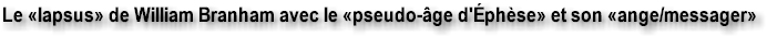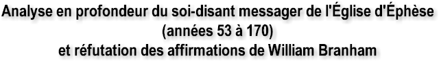 la sorte, il perd toute crédibilité en faisant la démonstration d'un raisonnement illogique. C'est tout l'enseignement des Sept Âges de l'Église qui est remis en question. Cette page était dédiée au «soi-disant» ange/messager de l'Église d'Éphèse et j'ai clairement réfuté avec une démonstration logique que William Branham a erré dans son interprétation des Écritures. Il s'est inspiré des travaux de