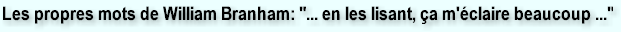 j’ai ramassé autant de livres anciens que j’ai pu, dans les bibliothèques et tout, et je fais mon humble part, en faisant solennellement confiance à Jésus-Christ qu’Il me le révèle. En effet, si je veux savoir ces choses, ce n’est pas pour dire: “Moi, je sais ceci, et moi, je sais cela.” Il connaît mon cœur. Il m’écoute en ce moment. Mais, si je veux savoir, c’est dans le but d’éclairer Son peuple; c’est pourquoi je crois qu’Il va me donner de savoir.