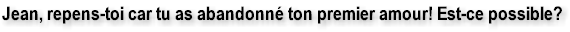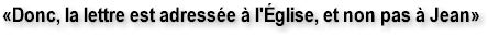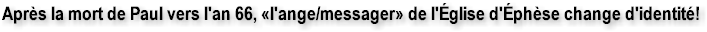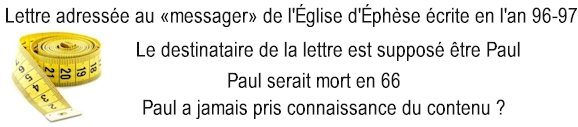 la vision. ● Le «messager» serait devenu l'apôtre Jean, après le décès de Paul en l'an 66 ● Ni Paul, ni Jean, n'ont abandonné leur premier amour, ni ont eu à se repentir de quoi que ce soit. Donc, la seule issue est d'attribuer toute la lettre à l'Église d'Éphèse, ce qui est une erreur d'interprétation majeure. ● La lettre n'a pu être adressée à l'Église d'Éphèse, du fait que le tutoiement (pour une seule personne) au singulier, ne s'accorde pas avec le genre féminin ou au pluriel.