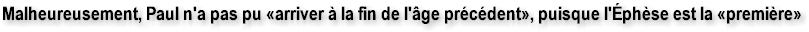 Est-ce que quelqu'un a déjà demandé à William Branham, quel était «l'âge» avant «celui d'Éphèse»? Pourquoi a-ton-volontairement escamoté l'affirmation de William Branham disant que «le pseudo-messager Paul» de l'Église d'Éphèse était «arrivé» à la fin de son âge? Il faut comprendre que si «l'âge d'Éphèse», est le premier âge, il ne pouvait y avoir de «chevauchement» avec un âge précédent et le «pseudo messager» qui est Paul, n'a pas pu se pointer à la fin «de l'âge précédent» comme l'a mentionné William Branham à maintes fois. Le pseudo âge d'Éphèse se termine vers l'an 170 et Paul serait mort vers l'an 66.