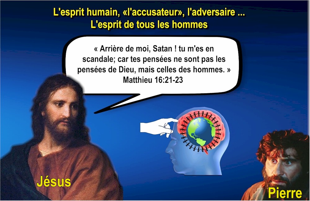 Jésus ne confond pas Pierre avec Satan, mais s'adresse à l'esprit humain de Pierre, car Pierre ne connaîtra l'authentique nouvelle naissance que plus tard. L'accusateur, la pensée universelle de tous les hommes Matthieu 16,21-23 «Arrière de moi, Satan ! tu m'es en scandale ; car tes pensées ne sont pas les pensées de Dieu, mais celles des hommes.» Marc 8:33 « Alors Pierre le prit à part et se mit à le reprendre, mais Jésus se retourna, regarda ses disciples et réprimanda Pierre en disant: «Arrière,