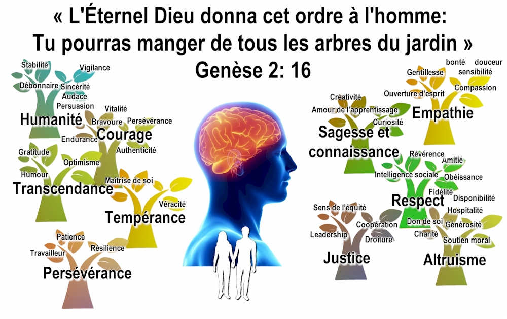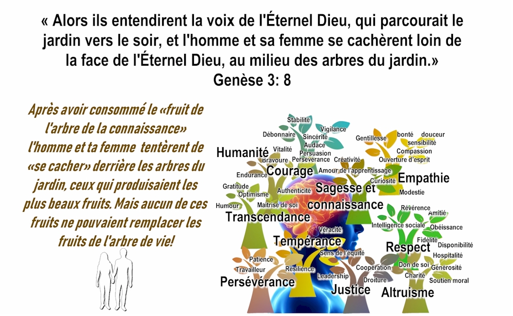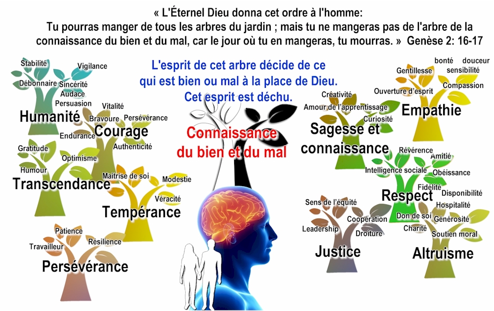 saint ou parfait. L'esprit de cet arbre nourrit l'homme de fruits légalistes, de règles à suivre, de codes moraux, qu'il interprète comme étant des préceptes et des lois divines pour plaire à Dieu. L'esprit de cet arbre devient un accusateur devant Dieu, si l'homme enfreint ce que l'arbre prétend être bien ou mal. Le crime de cet arbre, c'est qu'il a usurpé le rôle de l'arbre de vie. |