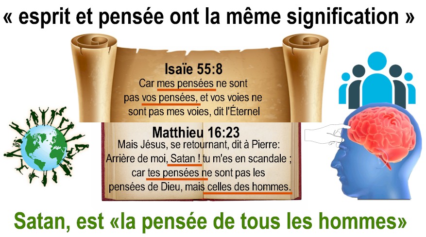 1 jean 3: 9-10 , est avec l'accusateur et l'adversaire un seul esprit. Ainsi donc, contrairement à l'opinion généralement répandue, le mot «Satan» n'est pas un nom, mais une désignation. Satan signifie «l'esprit adversaire» ou la «pensée adversaire», «l'esprit qui s'oppose», «la pensée ennemie»,