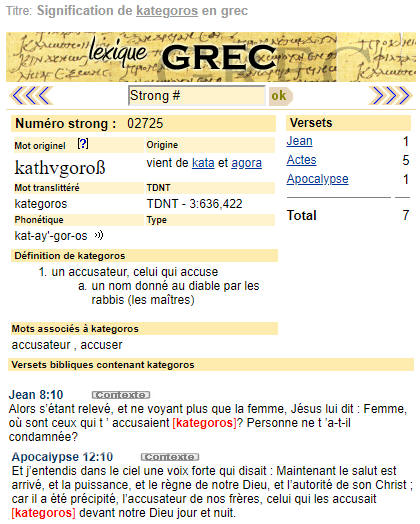 Le terme grec du mot accusateur dans Apocalypse 12:10 est «kategoros» (Strong #02725)