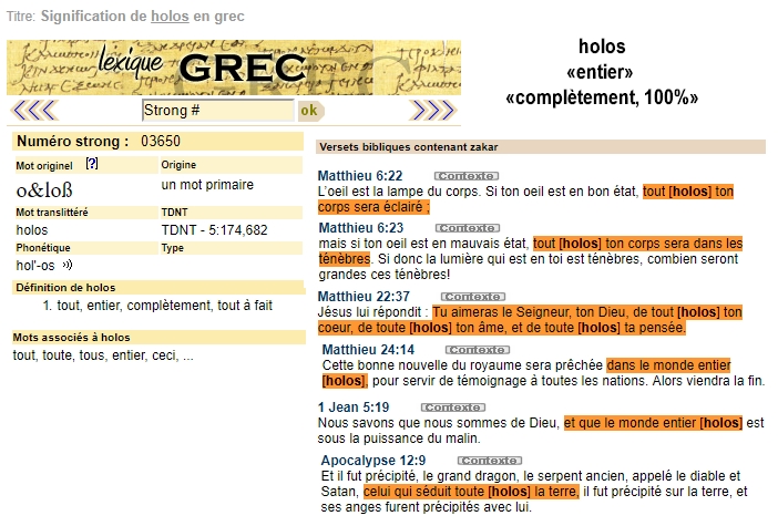 ne pourrait pas s'appliquer à l'esprit humain dont Jésus a affirmé que les pensées des hommes ne sont pas celles de Dieu. Dans le texte original grec, le mot utilisé dans «toute ta pensée» est le mot [holos] qui porte la référence Strong #03650, qui est interprété comme «entier, complètement, à 100%». Puisque l'esprit humain ne saurait rencontrer l'intensité d'une