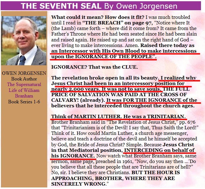 signifie que ce qu'a déclaré William Branham après 1963 est plus près de la vérité que ce qu'il a affirmé dans les années 50s, car la rhétorique de William Branham a vraisemblablement évolué au cours des dernières années de ses prédications . En ce qui concerne les sites web réfutant les enseignements de William Branham, la majorité de ceux qui ont tenté de convaincre leurs lecteurs, qu'ils avaient raison et que William Branham avait tort, n'ont jamais offert plus que leurs propres opinions ou convictions, et n'ont rien apporté de plus que ce qui est déjà connu et enseigné. Des auteurs baptistes, évangéliques,