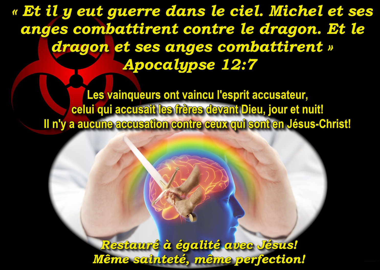 cet exposé, est que j'ai été littéralement «poussé à le faire» et si ce n'est pas moi qui l'aurait fait, le Seigneur aurait choisit quelqu'un d'autre! C'est la déclaration de guerre du Seigneur, pas la mienne! C'est Sa guerre telle que prophétisée dans Apocalypse 12:7! Si vous croyez que le Seigneur revient, commencez d'abord par identifier son Esprit et ceux qui en sont inspirés! Il est évident que personne n'oserait publier ce que je publie, à moins qu'il soit vraiment certain et instruit sur les thèmes que je désire partager. Vous remarquerez sans doute dans les diverses pages du site web qu'il s'y trouve plusieurs textes qui sont des répétitions déjà présentes dans d'autres pages, et c'est intentionnel, car je préfère me répéter inlassablement pour être bien certain que j'ai utilisé toutes les variantes et les illustrations