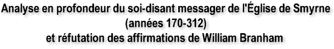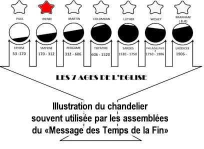 personnage et ne pouvait qu'errer et induire en erreur tout son auditoire. Lorsque William Branham a affirmé que ce personnage avait la même foi que l'apôtre Paul, sa crédibilité en tant qu'enseignant est devenue complètement nulle. Les défenseurs de William Branham l'excuseront peut-être en invoquant le principe de «la révélation progressive»! Mais malheureusement, le personnage d'Irénée de Lyon est demeuré «l'ange/étoile/messager» du soi-disant âge de Smyrne, jusqu'à la fin de la vie de William Branham. Seul un faux prophète, dans tout le sens du terme, pouvait enseigner de telles