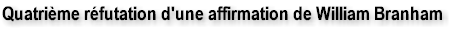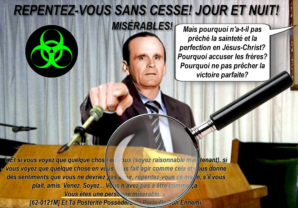 «Jésus est le même, hier, aujourd'hui et éternellement!» Comment l'excuser? Pour ma part, je juge William Branham pour avoir induit en erreur toute l'Église et jamais cet homme ne règnera sur le trône avec les vainqueurs! Jamais! Je le jure devant mon Dieu! Je ne peux que vomir ses enseignements! Les enseignements de William Branham, nous ont servi des «moines» obsédés par le monachisme ascétique pour