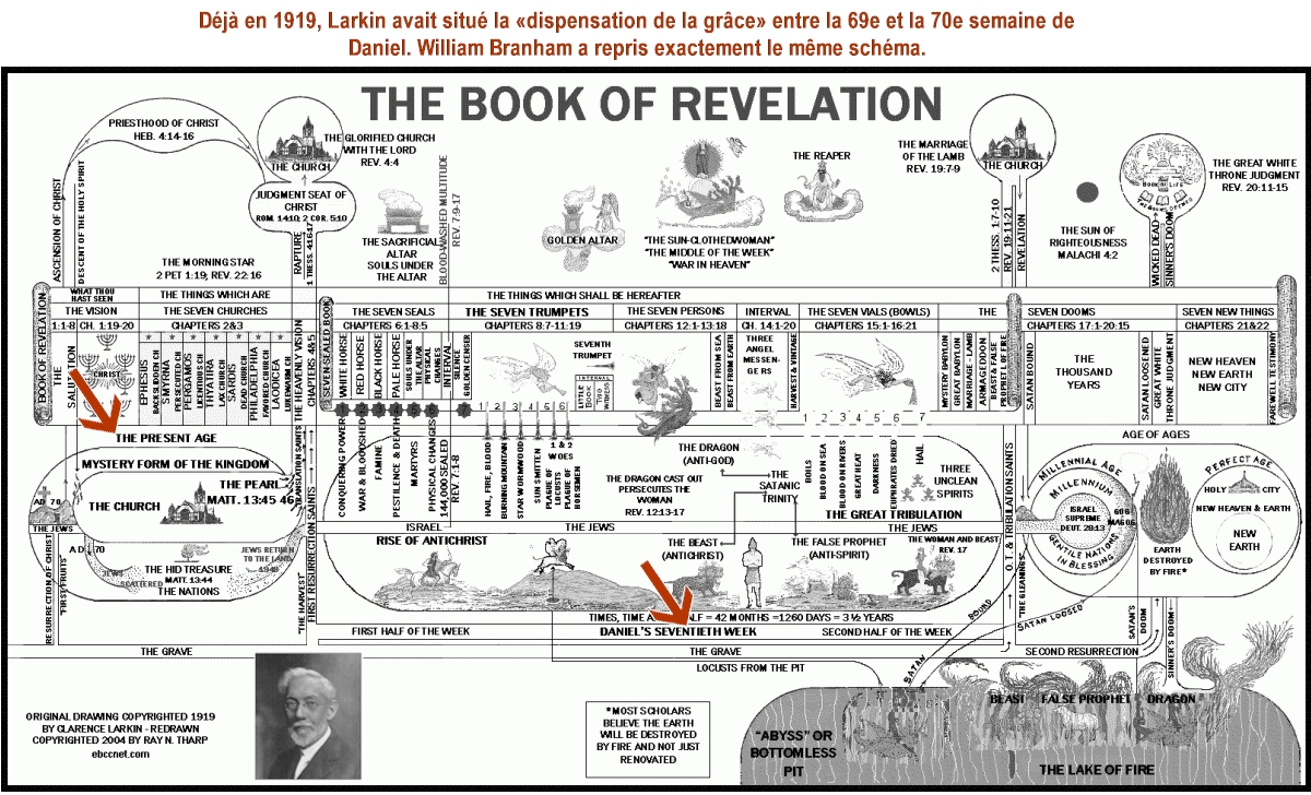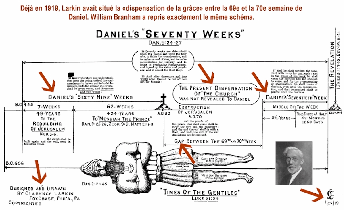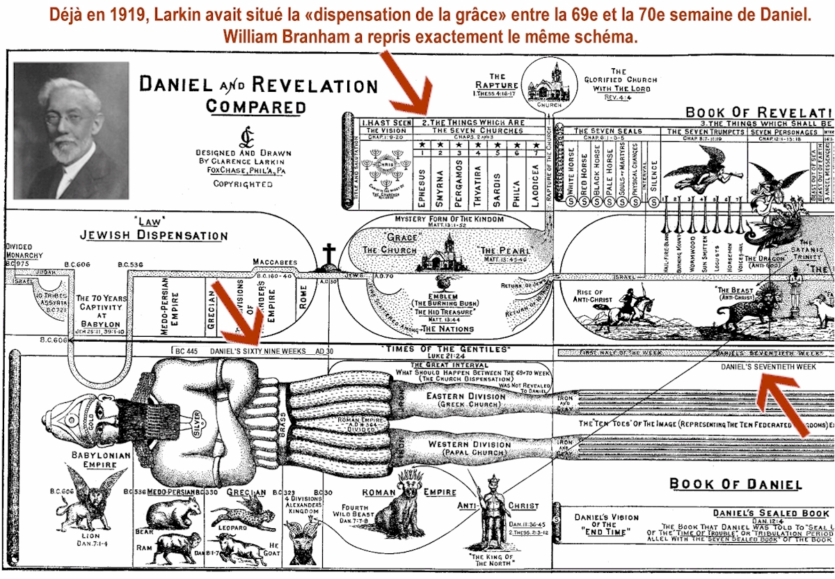 «révélation divine» sur ce thème, car la doctrine existe déjà et est très répandue dans les milieux évangéliques et baptistes. Le théologien Baptiste Clarence Larkin en a déjà publié «une version améliorée» depuis 1918. Tout comme Cyrus Ingerson Scofield (Bible annotée) et Nelson Darby (Bible Darby), Clarence Larkin a développé l'approche «dispensationaliste» pour interpréter les chapitres 2 et 3 de l'Apocalypse et inclure la version «de la soixante-dixième semaine de Daniel» qui affirme qu'il existe une alliance distincte entre Dieu et le peuple Juif au sens littéral, lesquels seront