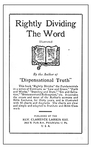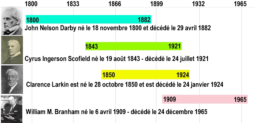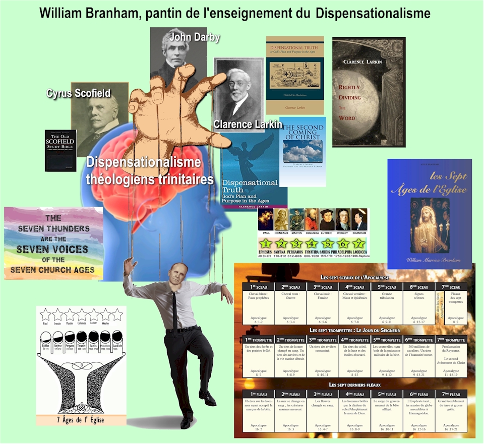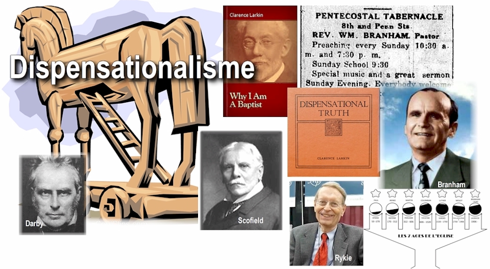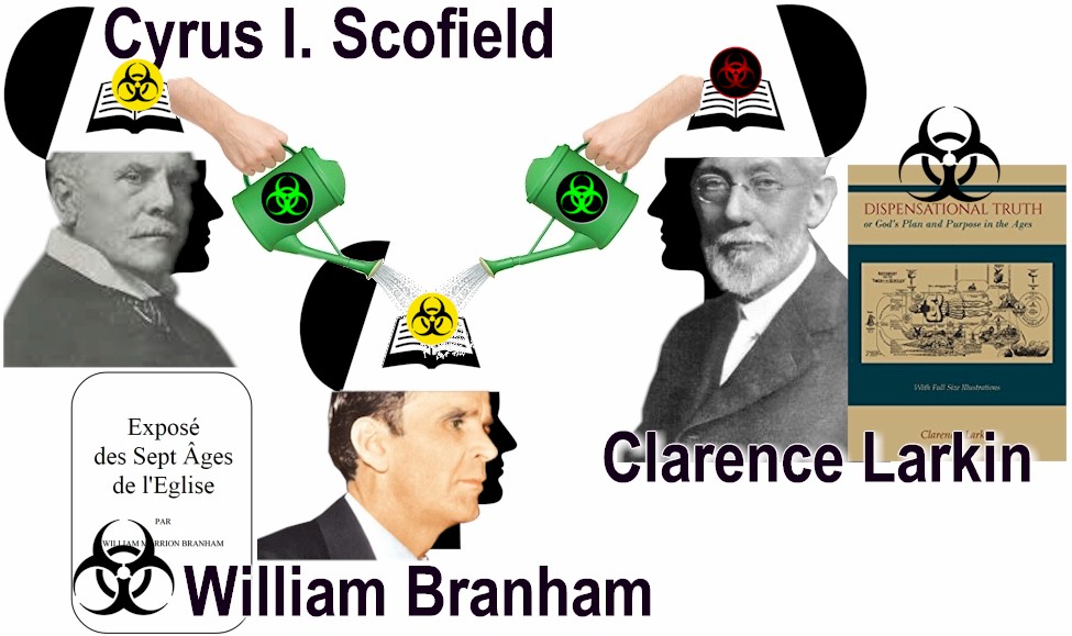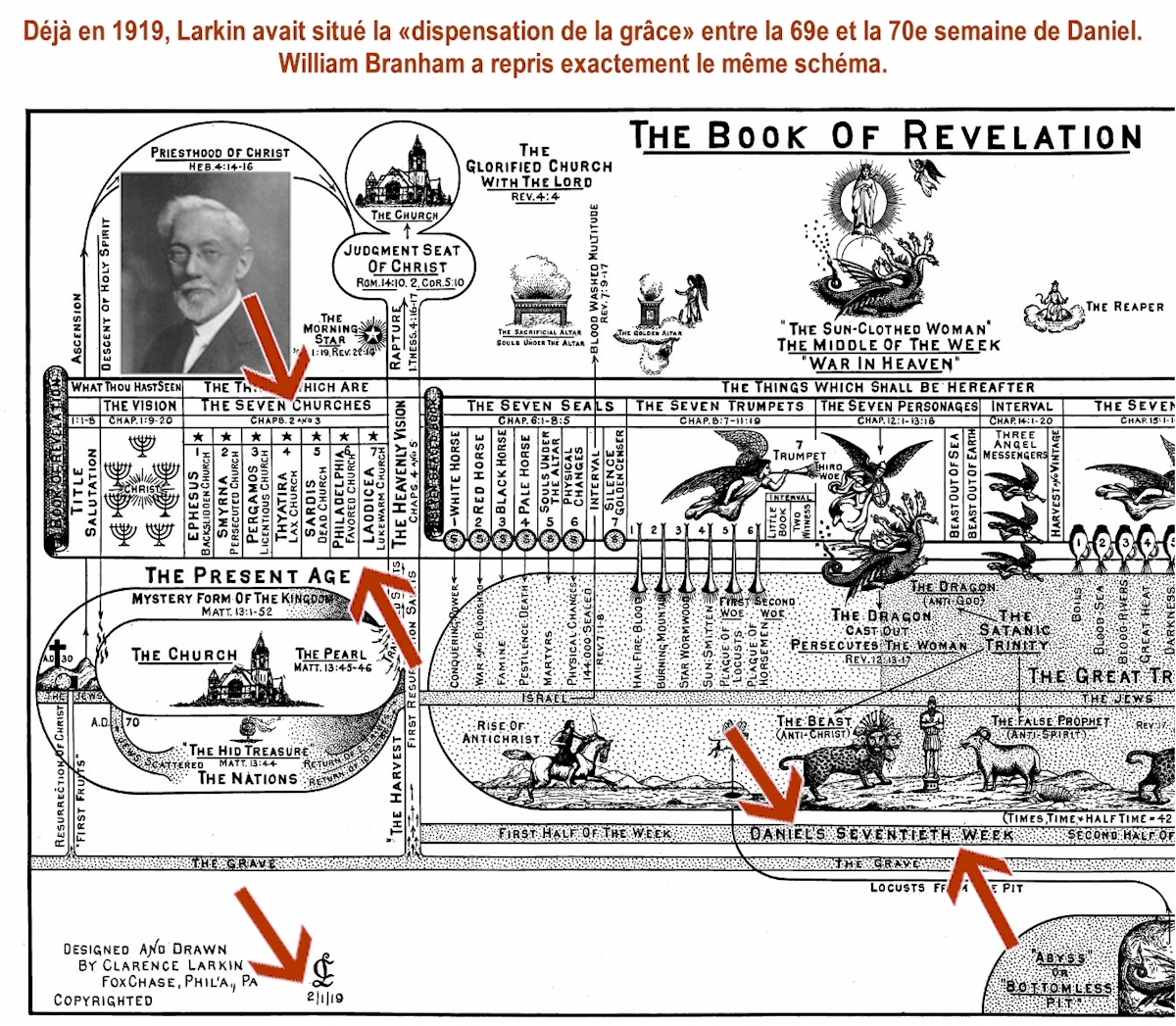 «révélation divine» sur ce thème, car la doctrine existe déjà et est très répandue dans les milieux évangéliques et baptistes. Le théologien Baptiste Clarence Larkin en a déjà publié «une version améliorée» depuis 1918. Tout comme Cyrus Ingerson Scofield (Bible annotée) et Nelson Darby (Bible Darby), Clarence Larkin a développé l'approche «dispensationaliste» pour interpréter les chapitres 2 et 3 de l'Apocalypse et inclure la version «de la soixante-dixième semaine de Daniel» qui affirme qu'il existe une alliance distincte entre Dieu et le peuple Juif au sens littéral, lesquels seront