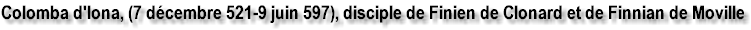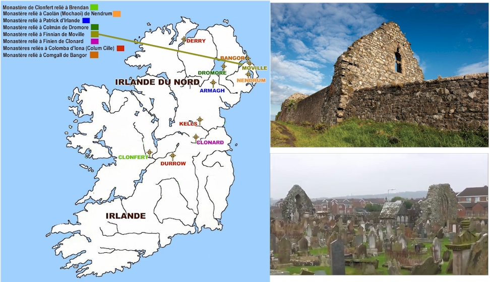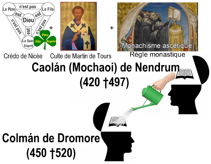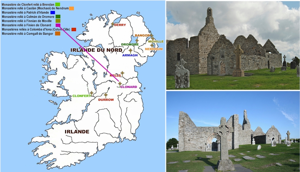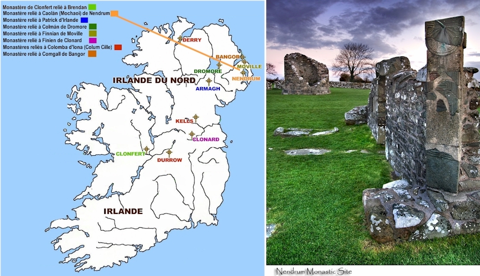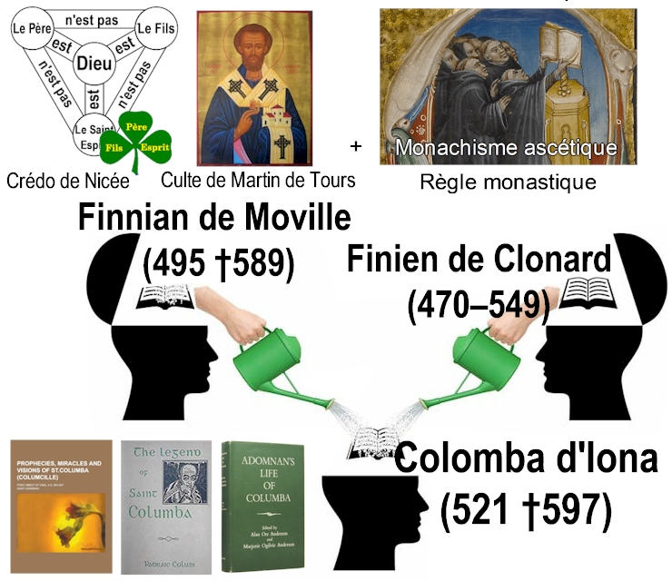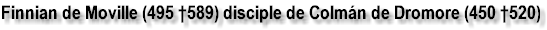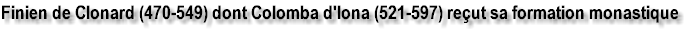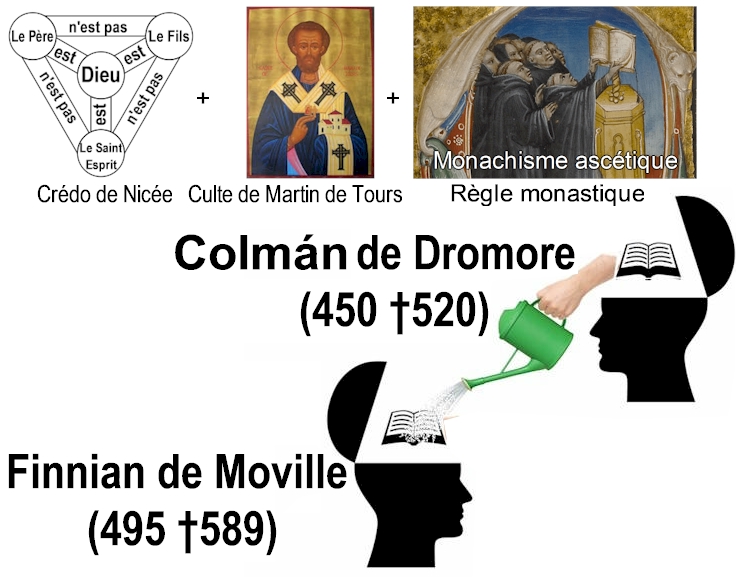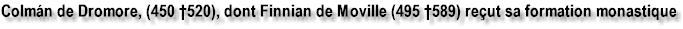Colmán de Dromore, (450-520), dont Finnian de Moville (495-589) reçut sa formation monastique Finien de Clonard (470-549) dont Columba d'Iona (521-597) reçut sa formation monastique Finnian de