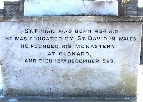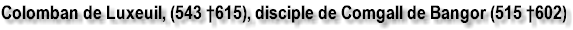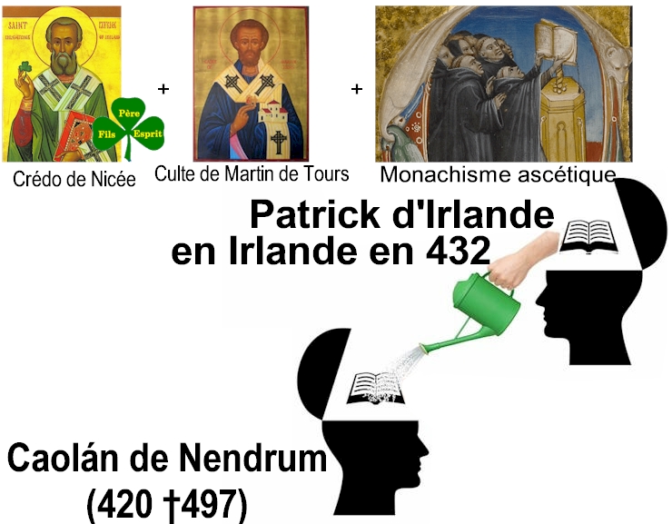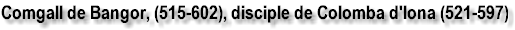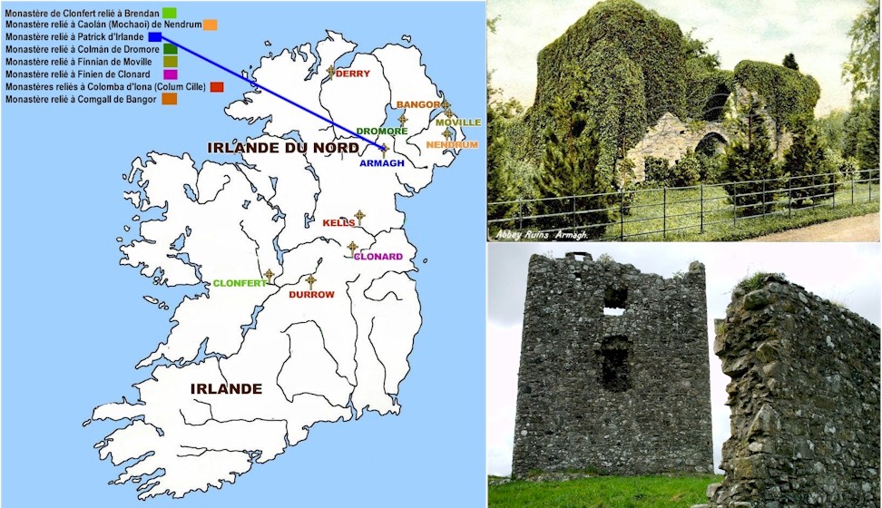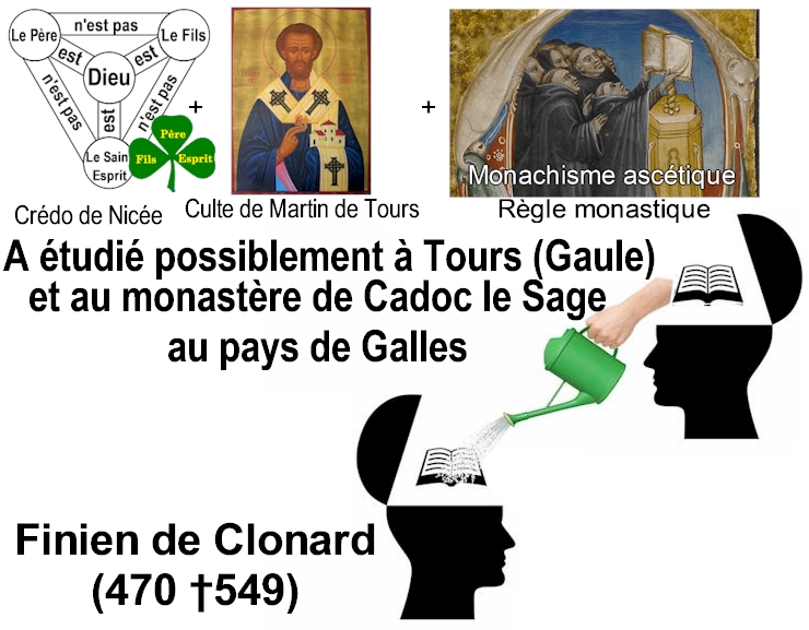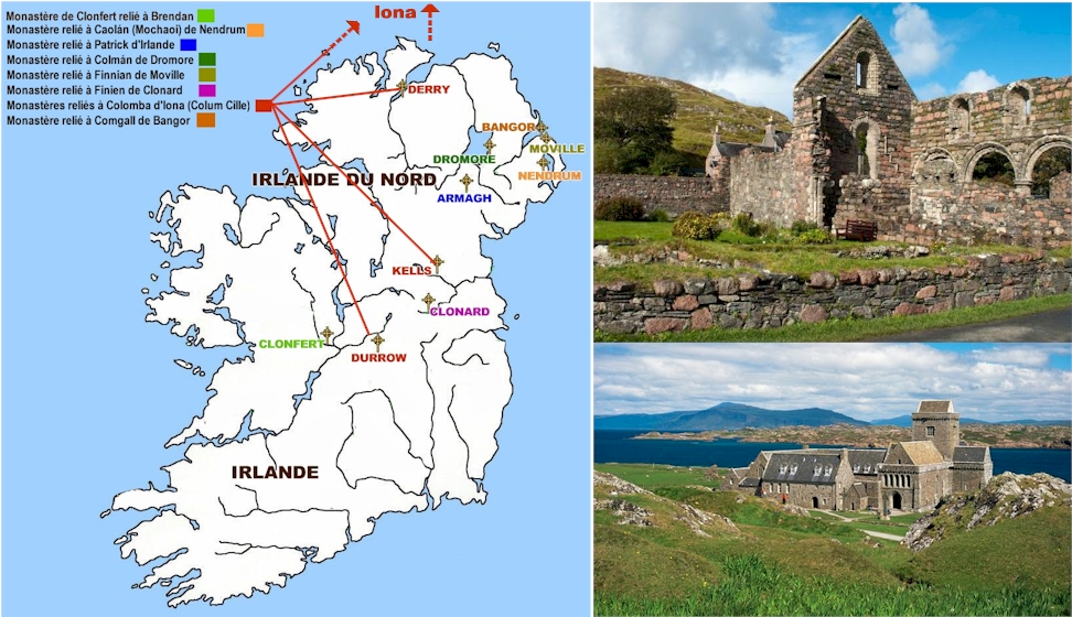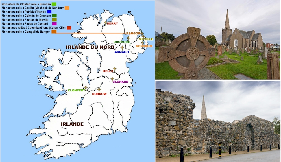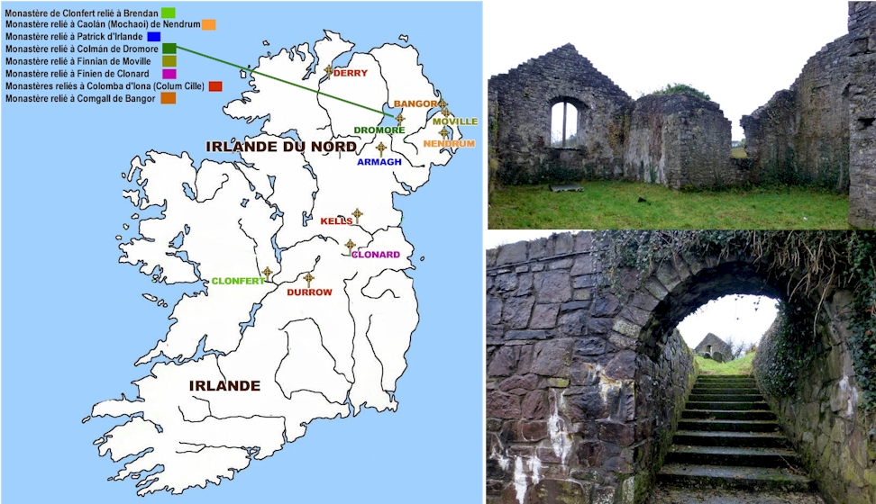 Colmán de Dromore, (450-520), dont Finnian de Moville (495-589) reçut sa formation monastique Finien de Clonard (470-549) dont Columba d'Iona (521-597) reçut sa formation monastique Finnian de