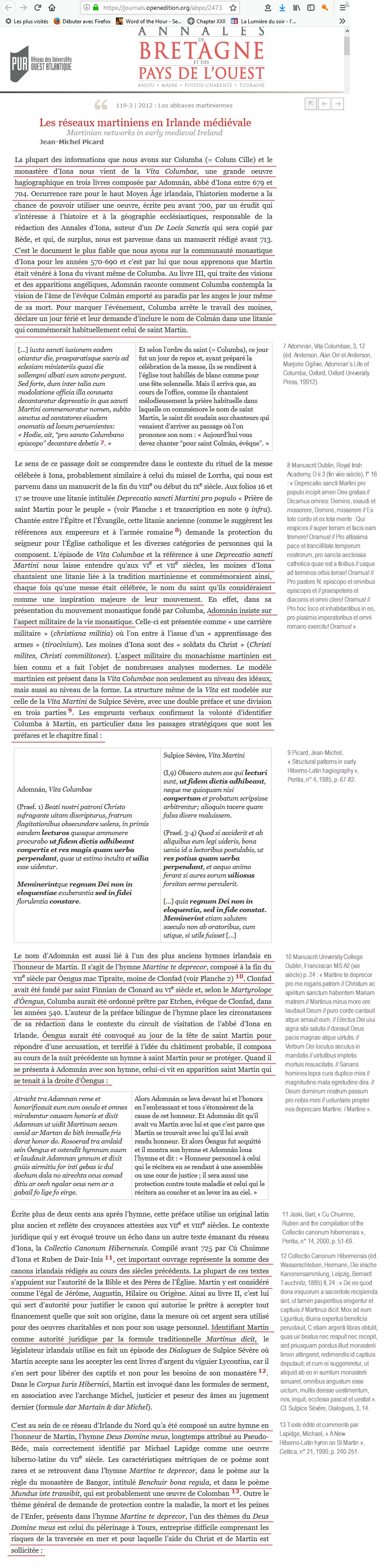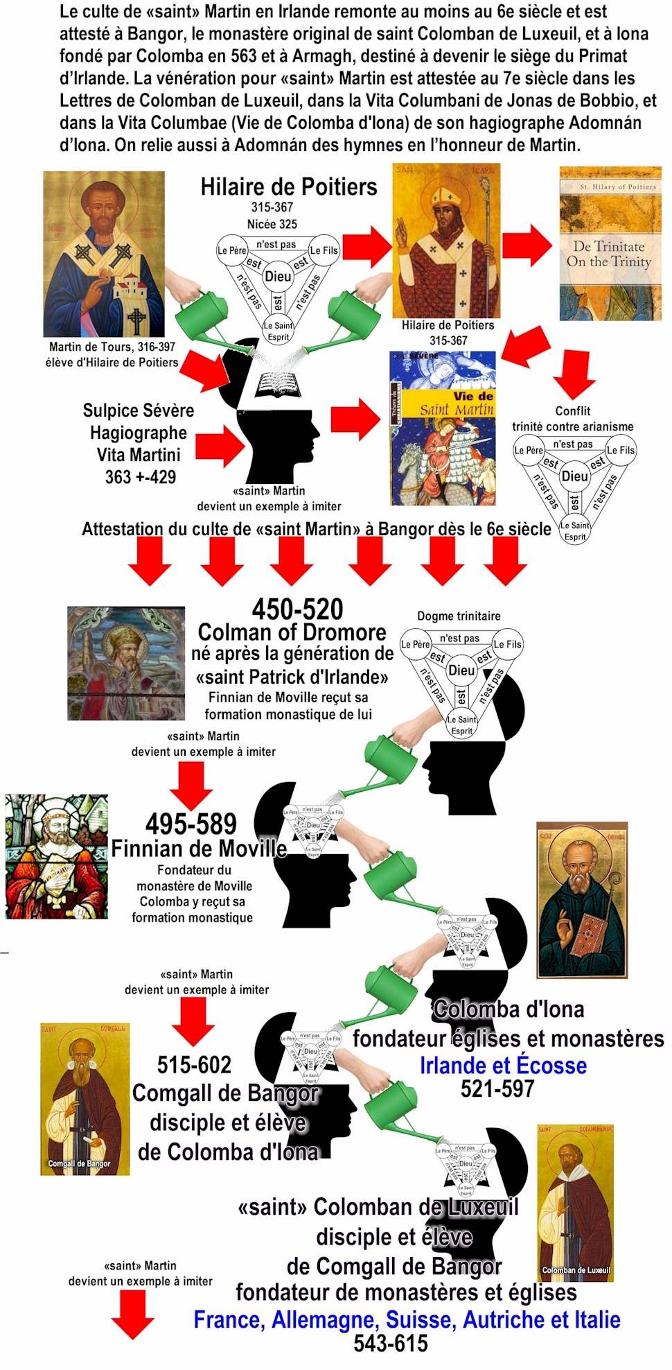 La piste du monachisme de «saint» Martin à l'extérieur de la Gaule Le culte de «saint» Martin chez les moines irlandais Attestation du culte de «saint» Martin à Iona, chez les moines de Columba Le signe de la croix, symbole du trinitarisme Columba et «le signe de la croix » L'Altus Prosator, un hymne à la gloire du dogme trinitaire Nicéen, composé par Columba d'Iona