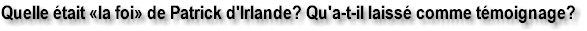 À la lumière des textes attribués à Patrick d'Irlande, si l'on tient compte de sa propre déclaration de foi dans le dogme Trinitaire nicéen de l'Église de Rome, il nous est permis de croire que ce personnage n'avait d'autre «message» que celui véhiculé par l'orthodoxie de l'Église romaine de son