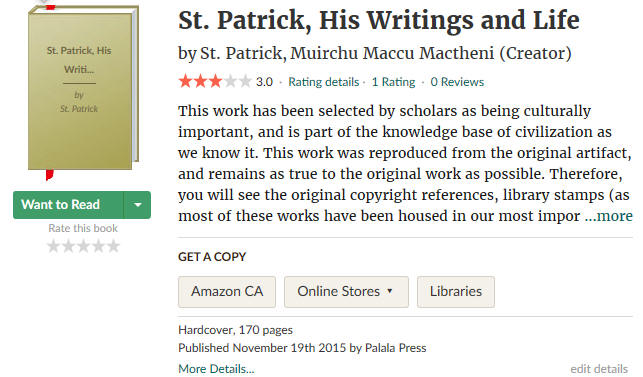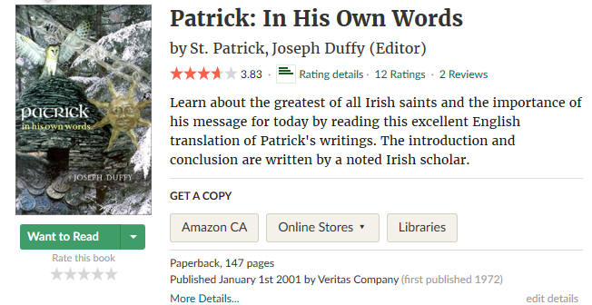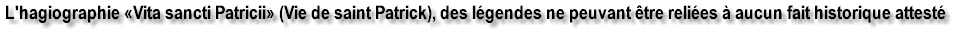 «Que trouve-t-on dans la «Confessio» de Patrick , plus d'un millénaire et demi après sa composition? En répondant à cette question, il est frappant d’abord de noter ce que nous ne trouvons pas là - aucune référence au trèfle, aucune indication de chasses de serpents, et aucune désignation de la montagne où Patrick s'occupait d'animaux en tant qu'esclave (ni Slemish ni Croagh Patrick ni, d'ailleurs, Lough Derg n'est mentionné); il n'y a pas non plus d'allusion au feu pascal sur la colline de Tara, ni au roi Loíguire. Tous ces ingrédients, dont nous avons hérité dans le cadre du récit plus large de Patrick, découlent de traditions et de circonstances ultérieures.
