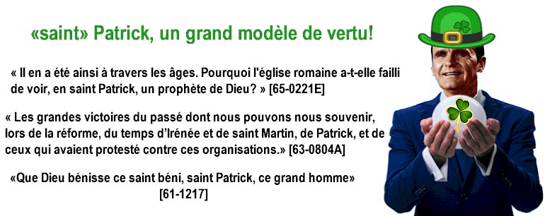 Prédication Qui est ce Melchisédek? [65-0221E] «(164) Combien de fois, à travers les âges, quand Tu envoyais des choses, les gens ne les ont pas saisies. L'homme loue constamment Dieu pour ce qu'Il a fait et parle des grandes choses qu'Il va faire, mais il ignore ce qu'Il est en train de faire. Il en a été ainsi à travers les âges. Pourquoi l'église romaine a-t-elle failli de voir, en saint Patrick, un prophète de Dieu? » (un prophète ???) |