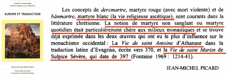 du 7ème siècle ou celle de St Columba un siècle plus tôt. En outre, en écrivant sa vie de Columba, Adamnan a été clairement influencé par la vie de St Martin par Sulpice Sévère...» |