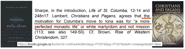 motivation de Columba d'Iona, était plutôt axée sur «une vie monastique plus parfaite» ou «un martyre blanc» que pour «l'aspect missionnaire»